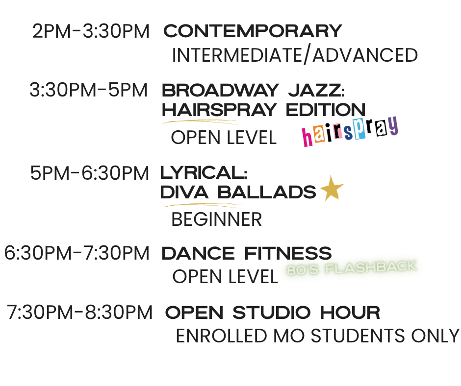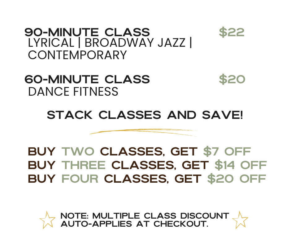 Click the button below to select the classes you’re gonna take (YAY!) and checkout with your selections. We’re hype to dance with you!